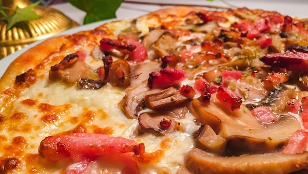 Masa semifina artesana, nata, mozarrella, champiñones y bacon ahumado salteado, con un toque de aceite de oliva y orégano