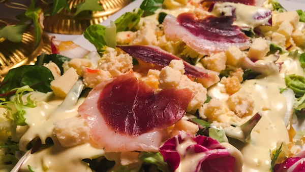Base de vegetales variados bañados en salsa de yogurt de mango, dados de queso de papaya y mango, nueces y lonchas de jamón de pato. Esta ensalda se come con tres de los cinco sentidos: Vista, olfato y gusto.