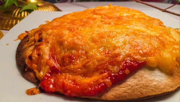 Recubiertas de nuestra salsa de tomate y gratinado con una mezcla de quesos, dos tortas de trigo que esconden en su interior una parrillada de pimientos rojos, verdes, cebolla, zanahoria y tiras de pollo braseadas.