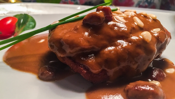 Empanado de solomillo con foie y salsa de pasas con piñones