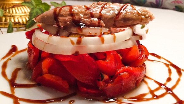 Pimientos asados y julianas de cebolla fresca, coronado con lomo de atún en aceite de oliva y aderezado con auténtico balsámico italiano de la región de módena.