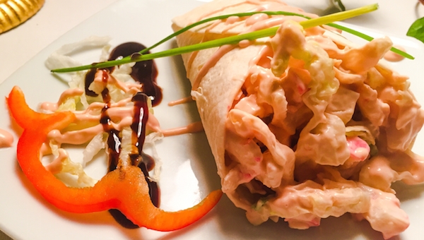 Torta de trigo rellena con una mezcla de gambas, taquitos de surimi, ralladura de manzana, lechuga en juliana y nuestra salsa rosa con un toque brandy. Una manera diferente de comer un cocktail, pero sin perder su encanto.