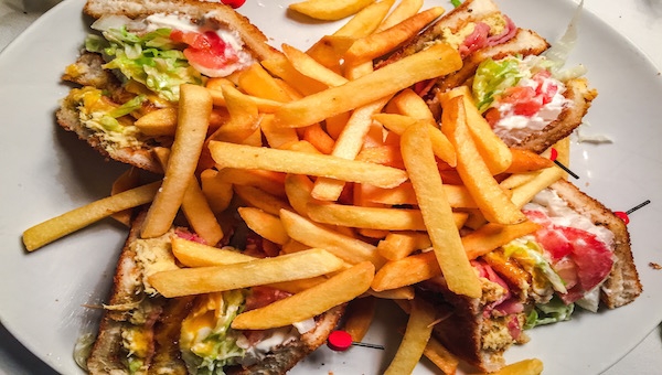 Sandwich de dos pisos trichado en cuatro porciones, relleno de pollo horneado y macerado en mostaza y especies, lonchas de bacon y huevo a la plancha, lechuga, tomate, cebolla y mayonesa.