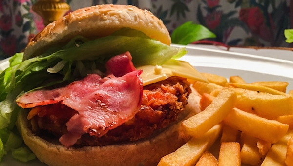 Hamburguesa de pollo rebozada en maíz crujiente, bacon a la plancha, queso y acompañado con patatas fritas.